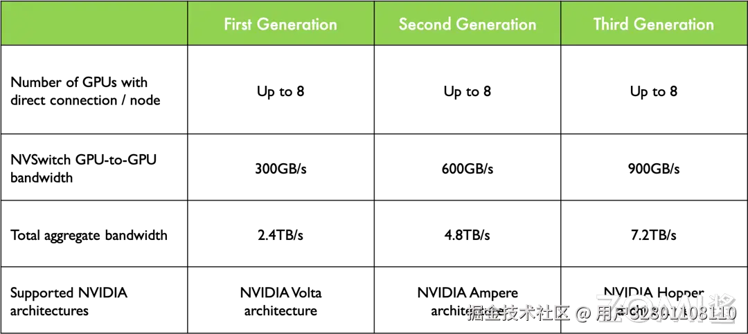 如上图所示,NVSwitch 技术从 Volta 架构到 Hopper 架构,经历了三代的演进与发展。在每一代中,每个 GPU 互联的芯片模组数量保持不变,都为 8 个,这意味着互联的基本结构保持了稳定性和一致性。随着 NVLink 架构的升级,GPU 到 GPU 之间的带宽却实现了显著的增长,因为 NVSwitch 就是 NVLink 具体承载的芯片模组,从 Volta 架构的 300GB/s 增加到了 Hopper 架构的 900GB/s。