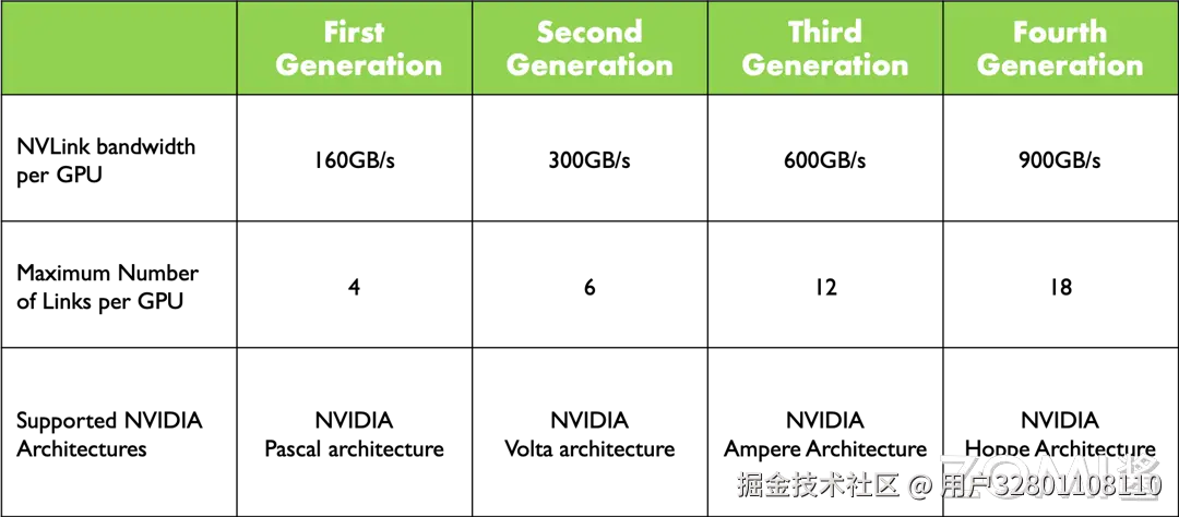 NVLink:NVLink 是一种由英伟达开发的高速互连技术,可实现 GPU 之间的直接通信。NVLink 可以提供比 PCIe 更高的带宽和更低的延迟,适用于要求更高通信性能的任务。