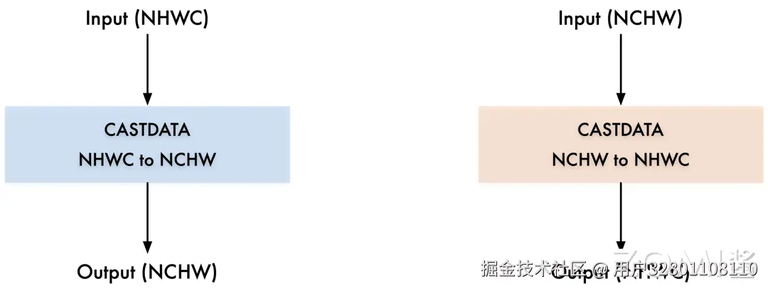 下面我们来看看数据转换具体是如何操作的。如下图所示,这两个都是数据转换的算子,数据转换我们在这里用 CASTDATA 算子来表示,左侧输入的数据格式为 NHWC,输出的数据格式为 NCHW,那么就需要一个数据转换算子节点来将数据格式由 NHWC 转换为 NCHW,右侧则相反过来,此处不再赘述。