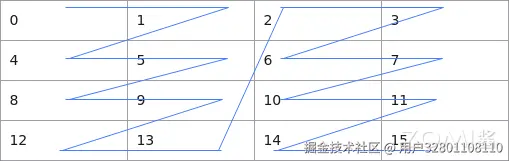 为了在达芬奇架构中更高效的搬运和进行矩阵计算,引入一种特殊的数据分形格式,NZ 格式。 如下图所示,我们以 4*4 的矩阵来进行举例,按照 NZ 格式数据在内存中的排布格式为[0,1,4,5,8,9,12,13,2,3,6,7,10,11,14,15],按照 ND 格式数据在内存中的排布格式为[0, 1,2,3,4,5,6,7,8,9,10,11,12,13,14,15]。