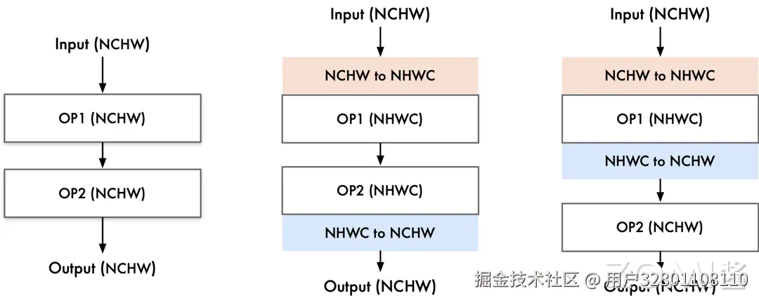 接下来,我们来看略复杂一些的数据转换。如下图所示,首先像最左侧,此处我们两个算子使用的数据格式与输入输出时都相同,为 NCHW,那么此时 AI 编译器中就不需要加入数据转换节点。