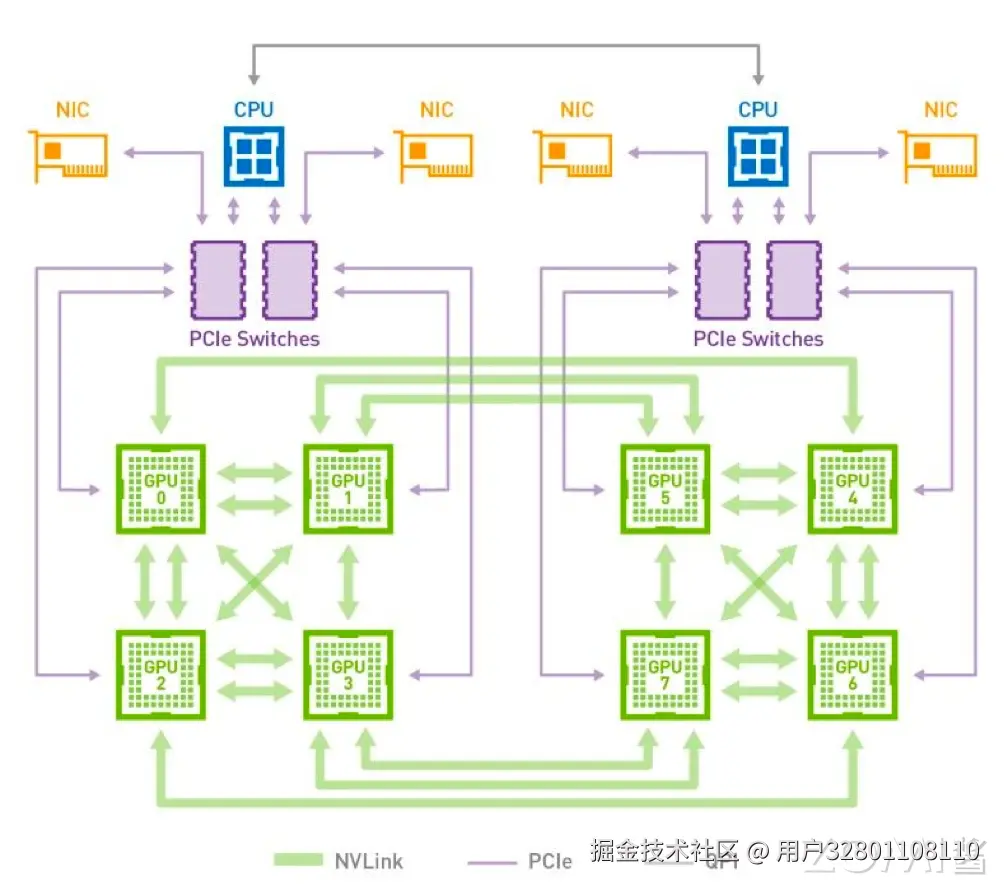 在英伟达推出其创新的 NVLink 和 NVSwitch 互联技术之前,构建强大计算节点的常规方法是通过 PCIe 交换机将多个 GPU 直接连接到 CPU,如下图所示。这种配置方式依赖于 PCIe 标准,尤其是 PCIe 3.0 版本,它为每个通道提供了大约 32GB/s 的双向带宽。虽然这在当时被视为高效的数据传输方式,但随着 AI 和机器学习领域的快速发展,数据集和模型的规模呈指数级增长,这种传统的 GPU-CPU 互联方式很快成为了系统性能提升的瓶颈。
