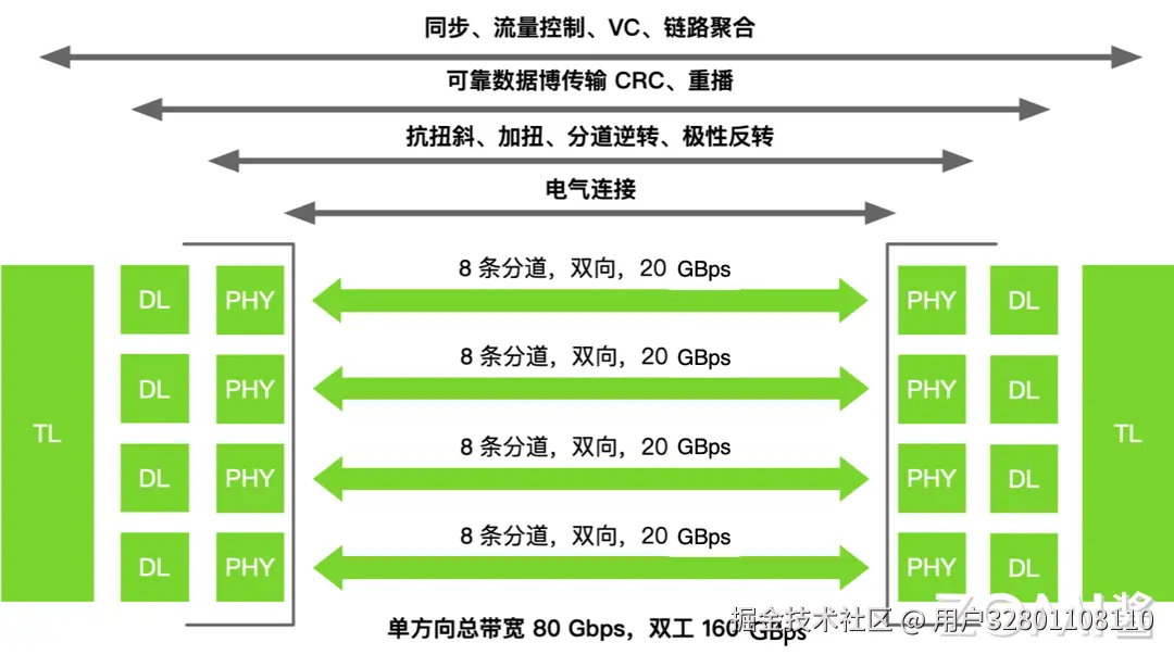 通过这种精心设计的电气和数据结构,NVLink 不仅提高了数据传输的速度和效率,还确保了在高速传输过程中的稳定性和可靠性,为高性能计算提供了强有力的支持。