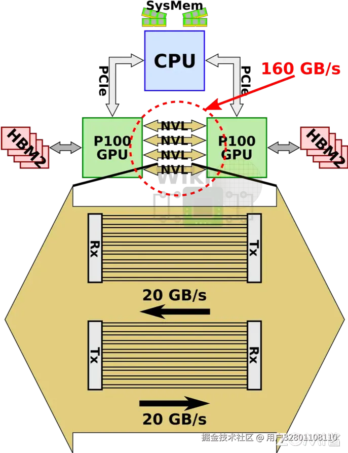 为了克服传统 PCIe 通信带宽的限制,英伟达开创性地推出了一种名为 NVLink 的高速互连架构。这项技术首次亮相于 P100 GPU 中,标志着高性能计算通信技术的一大飞跃。NVLink 的设计初衷是为了超越传统的 PCIe 通道,实现 GPU 间以及 GPU 与 CPU 之间更高效率、更高带宽的数据传输。