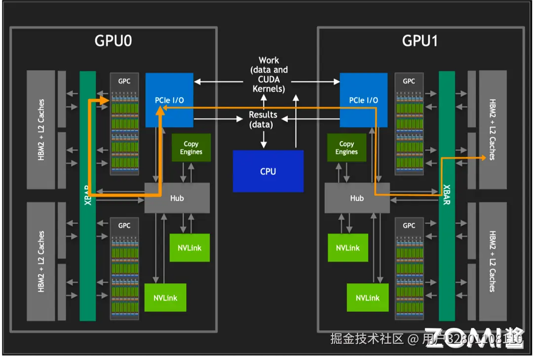 通过 CPU 的调度:在没有直接 GPU 对 GPU 通信能力的系统中,CPU 充当数据交换的中介。CPU 负责在多个 GPU 之间分配和调度计算任务,以及管理数据在 GPU 和系统内存之间的传输。