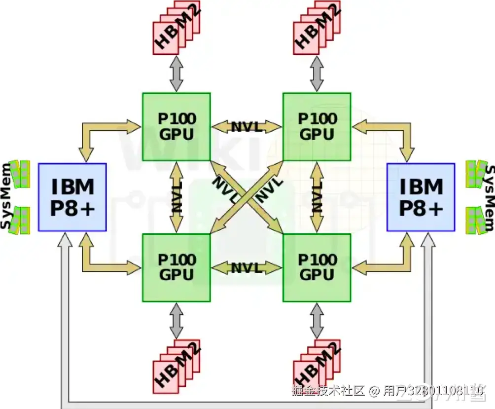 初代 DGX-1 通常采用了一种类似于上图的互联形式。不过,IBM 在基于 Power8+微架构的 Power 处理器上引入了 NVLink 1.0 技术,这使得英伟达的 P100 GPU 可以直接通过 NVLink 与 CPU 相连,而无需经过 PCIe 总线。这一举措实现了 GPU 与 CPU 之间的高速、低延迟的直接通信,为深度学习和高性能计算提供了更强大的性能和效率。