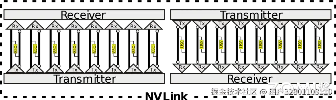 在 NVLink 的链接架构中,一个关键的概念是“Brick”,它指的是 NVLink 通道的基本单元。如上图所示,每个 NVLink 是一个双向接口,由 8 个差分对组成,总计 32 条线。这些差分对采用直流耦合(DC coupled)技术,并配置有 85 欧姆的差分终端,以优化信号传输质量。