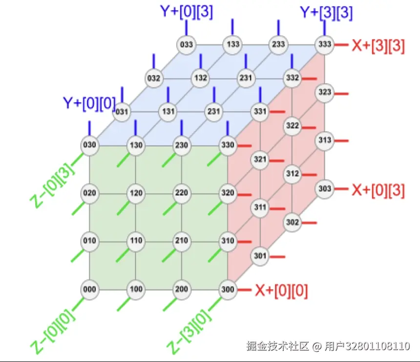 下图是一个 3D Torus Cube 的图示,我们可以看到每一个节点都会和上下、左右、前后的节点互联,而处于这个立方体边上的芯片会连接到在它相对面上的节点从而实现每一个节点都与 6 个节点互联。