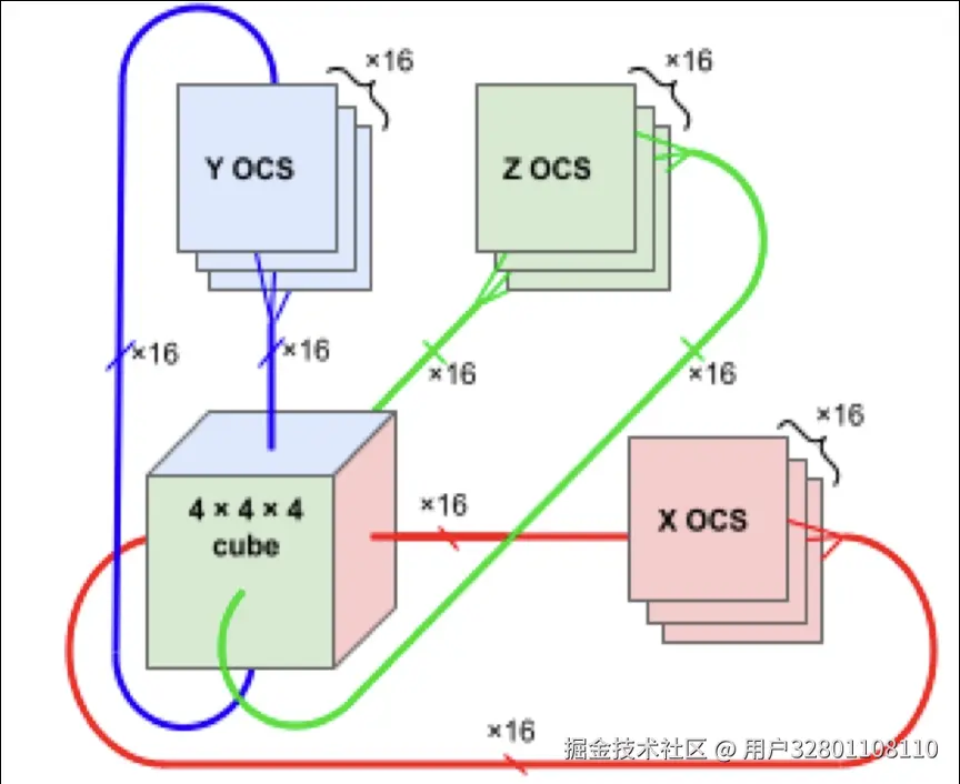谷歌在 TPU v4 Pod 中应用了光交换器(OCS)为了避免计算等通信。在如此大规模的超级计算机中,芯片间互联很大程度上决定整体计算效率;如果数据互联效率不够高的话,很多时候芯片都在等待来自其他芯片数据到达以开始计算。所以必须确保芯片之间互联高带宽,低延迟。而光互连对于物理距离较远的芯片就成为了首选。OCS 由 64 ()颗 TPU 构成一组 Slice 间互连,实现了 Pod 内 Slice 间全光互连(4096 TPUs);当然也可用于 Pod 之间互连而不仅局限于芯片之间。