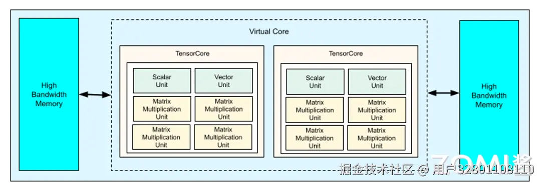 首先来看一下 TPU v4 的架构图,每个 TPU v4 都有两个 Tensor Core,每个 Tensor Core 里面有分别六个单元组成,其中有四个是 TPU 的最核心的脉动阵列 MXU,另外还有两个单元,一个是 Scalar Unit,另一个是 Vector Unit,这些都在前面的章节讲过。同时我们还看到两个 HBM 也就是内存模块,为了降低电缆的时延,它们分别被放在了 Tensor Core 的左右两边。