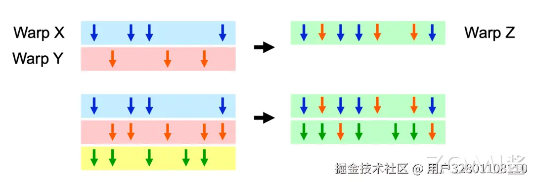 为了解决分支预测的问题,动态 Warp Formating/Merging 在分支后动态合并执行相同指令的线程,从正在等待的 Warps 中形成新的 Warps,分支下每条路径线程用于创建新的 Warp。可以将 Warp X 和 Warp Y 合并为 Warp Z,从而更好地执行相同指令。