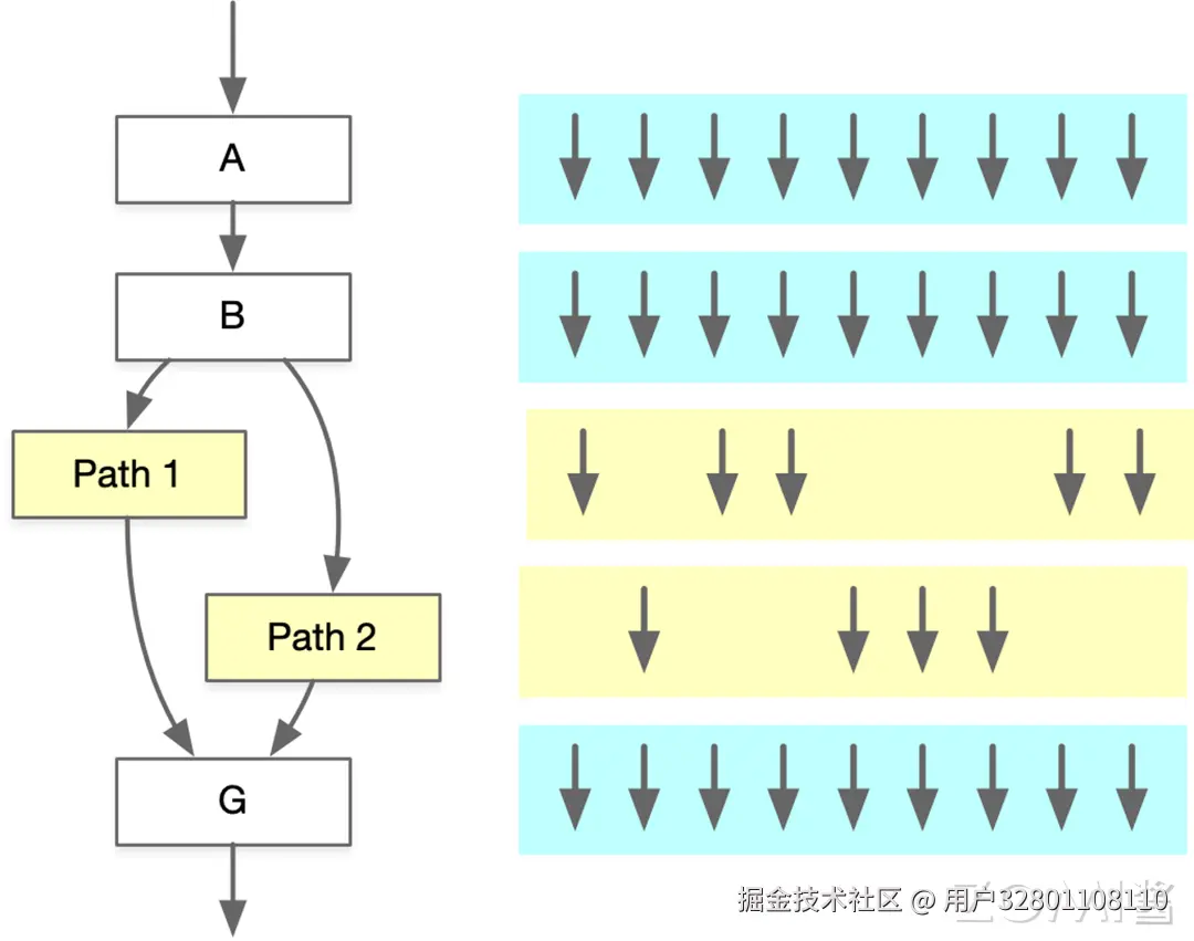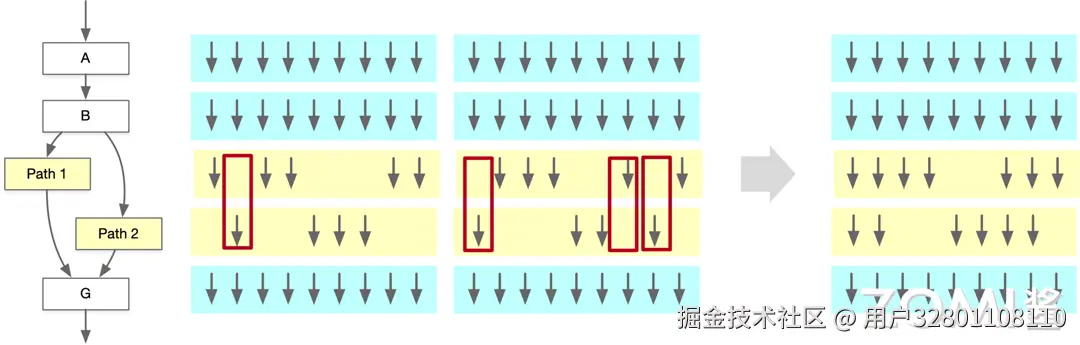 当存在 Path 1 和 Path 2 两条路径的时候,由于某些时钟周期为空,因此在动态合并分支之后执行相同指令的线程,以便同时执行不同的代码路径,从而避免线程之间的等待和资源浪费。
