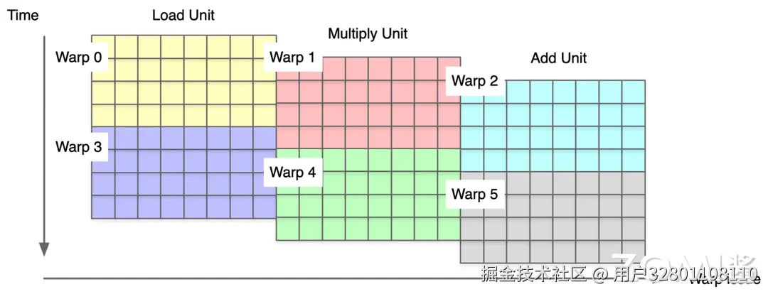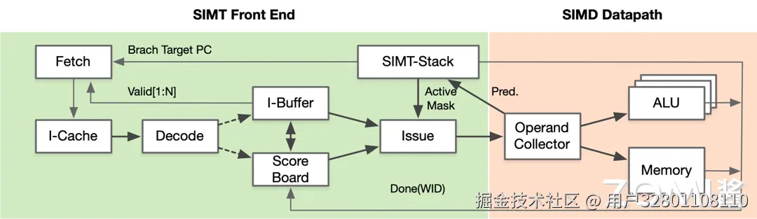 增加了 SIMT 前端硬件,通过线程组 Warp 隐藏线程指令流水。在 CUDA 编程模型中,每一个线程块(thread block)内部需要有很多并行线程,隐式分成了若干个 Warp,每个 Warp 包含串行交错的访存和计算。GPU 通过 Warp Scheduler 动态交错执行,如果一组 Warp0 流水阻塞就会切到下一个 Warp1,隐式通过 Warp 的并行掩盖指令流水阻塞,因此开发者可以得到较好的性能。