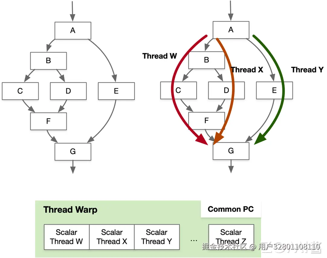英伟达 GPU 可以使线程在 Warp-base SIMD 上执行不同的分支,每个线程都可以执行带条件控制流指令(Conditional Control Flow Instructions),同时不同线程间可以分别执行不同的控制流路径(Different Control Flow Paths),比如分别执行不同的 Thread W,Thread X 和 Thread Y 控制流执行路径。