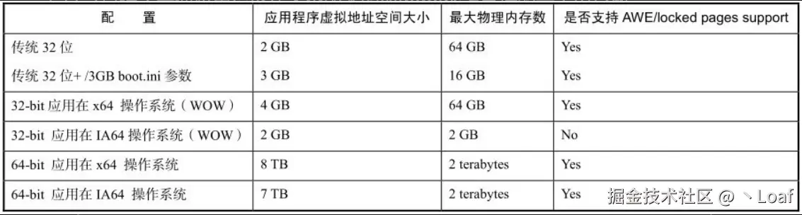 在32位的 Windows 操作系统中,虚拟地址空间总共为 4GB,其中 2GB 分配给用户态,剩余 2GB 分配给核心态。过去,常见的做法是通过修改 Boot.ini 文件,将用户态的内存扩展到 3GB,这样就会将内核态的内存压缩至 1GB。尽管这种方法可以增加用户态可用的内存,但它也会压缩内核态的内存使用,可能导致内核操作不稳定,从而影响系统的整体稳定性,尤其是可能会对 SQL Server 等应用程序的运行造成不良影响。
