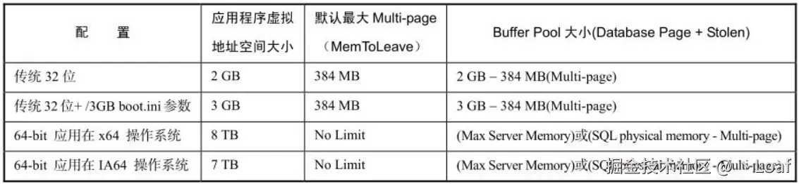 - 在32位的SQL Server上,Multi-page的数目是有限制的,所以也被称为MemToLeave。默认大小的计算公式是: