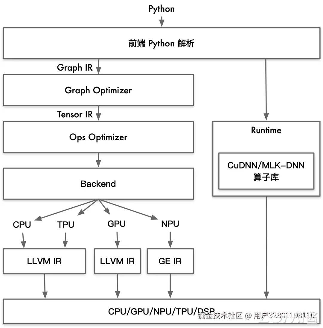 软件栈结构类似:它们都分成前端、优化、后端三段式,通过 IR 解耦前端和后端使得可以进行模块化表示。