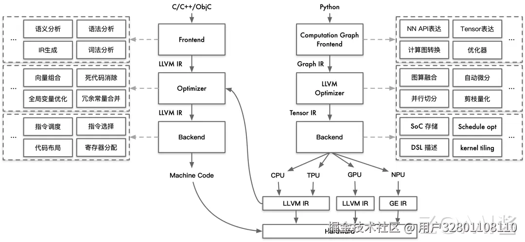 优化方式类似:在编译优化层,AI 编译器与传统编译器都是通过统一 IR 执行不同的 Pass 进行优化,从而提高程序执行时的性能。