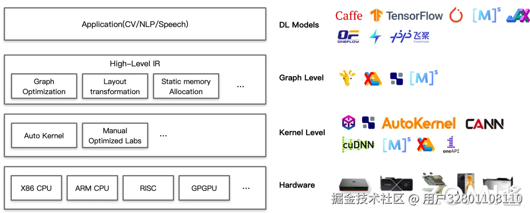 最下层的为硬件层,包括 X86 架构的 CPU、ARM 架构的 CPU、RISC、GPU 以及各种 NPU 例如华为昇腾 Ascend 系列等。硬件层包罗万象,是目前所有能拥有计算加速功能的设备的统称。