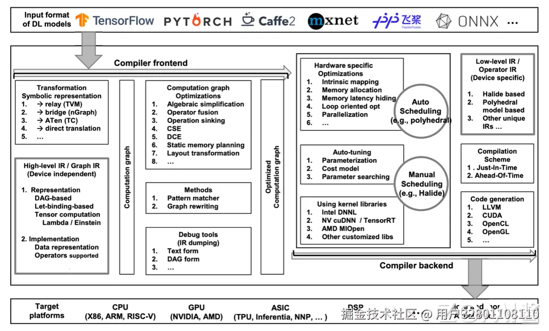 编译器后端的组成集中展示再上图中间靠右部分。首先进行硬件特定的优化,包括内在映射、内存分配、内存延迟隐藏、循环优化、并行化等;这些优化通过自动调度(如多面体模型)和手动调度(如 Halide)进行;自动调优模块包含参数化、成本模型和参数搜索,旨在进一步优化性能;后端还利用内核库(如 Intel DNNL、NV cuDNN/TensorRT、AMD MIOpen 等)来提高效率;低级 IR/操作符 IR(设备相关)采用 Halide、多面体模型等独特的 IR 实现;编译方案支持即时(Just-In-Time)和提前(Ahead-Of-Time)编译;最终,代码生成模块将生成 LLVM、CUDA、OpenCL、OpenGL 等代码,以支持各种目标平台,包括 CPU(X86、ARM、RISC-V)、GPU(英伟达、AMD)、ASIC(TPU、Inferentia、NNP 等)和 DSP 等,从而适配越来越多的加速器。