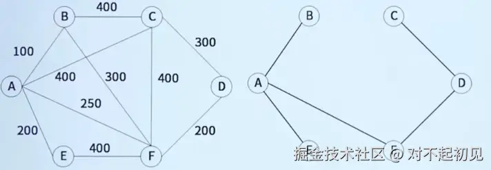 鲁斯卡尔算法:从最短的边开始选取,依次选取权重小的边,但不能组成环路。