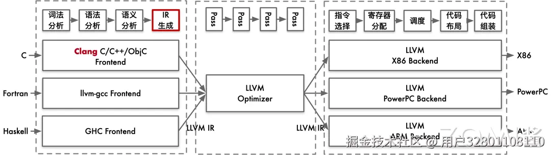 这个阶段属于代码生成之前的过程,和硬件与目标无关,所以在前端的最后一个环节是 IR 的生成