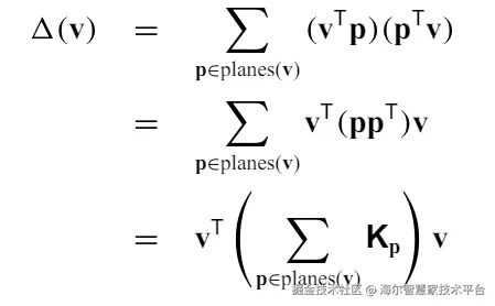 其中 就表示在 v 点的误差值(Error),也就是 QEM 的 E。而所谓的 QEM 这个度量值其实就是指这里使用矩阵表示的误差值,同时我们发现 中 v 是已知的,因为我们本来就有点的位置信息, 【回答 3】所以所谓的 QEM 具体来说应该是指 这一部分,用一个符号来表示就是 Q。上面公式也就简化成 。