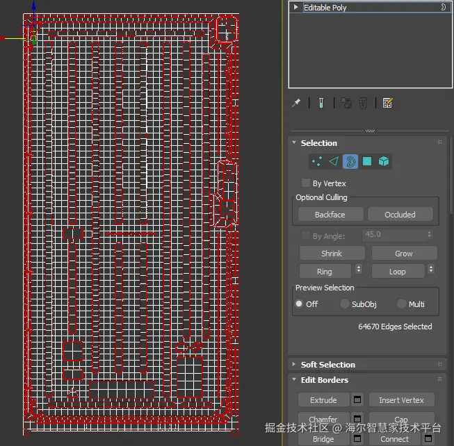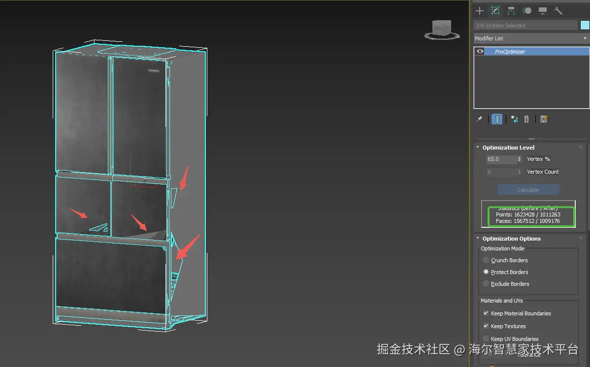 而为什么会产生这种破面,是因为 QEM算法只能保护单个轮廓。如果你的 【问题 8】模型存在多个轮廓,QEM 算法只会“分别”去保护这每一个轮廓,而不会考虑全局视角下的整体轮廓。以下方冰箱面板为例: