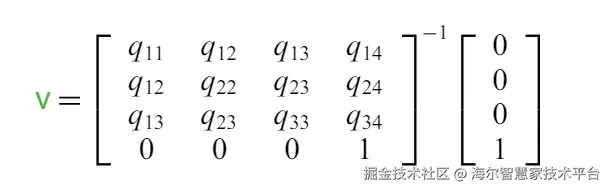 【回答 4】结论是通过计算 Q 的逆矩阵,然后乘以一个单位向量,就得到了新的点 v 的空间位置。因为我们已经有了 Q,所以新的点的位置计算不管对于计算机还是对于程序设计来说,都是很容易得到的。这也就是为什么我们偏要用矩阵形态来表示距离的二次方的原因。