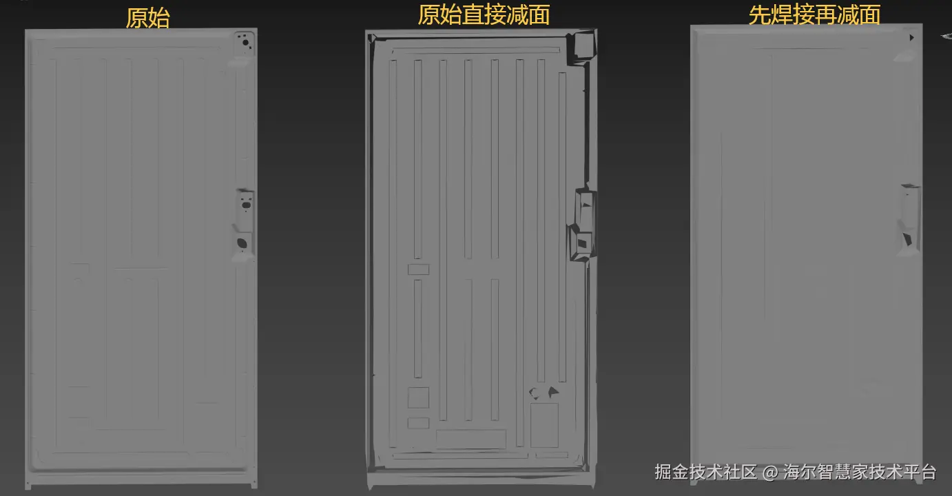 因为,轮廓在 QEM 减面过程中其实同时带来了正反两方面影响,反向影响就如上面所说,这些零碎的轮廓会在高比例减面下遭到轮廓破坏,进而导致模型从整体上看到一些破洞;但它也有正向的作用,那就是保护细节。因为在 ProtectBorder 机制下,轮廓上的边是最后被收缩的,这也就侧边保护了轮廓周边的细节。轮廓越多,就有越多的细节被保留。所以,当我们通过焊接大规模减少轮廓后,原本冰箱背板处那些位于轮廓边缘的细节就会跟普通的三角面一样平等的被合并,这些细节也就逐渐消失了,如下图所示: