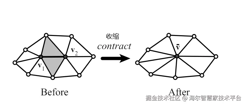但是,我们的目的是减少面,删点是不够的。实际上我们不是遍历点并删点,而是遍历边并收缩边,下图是一个直观的展示: