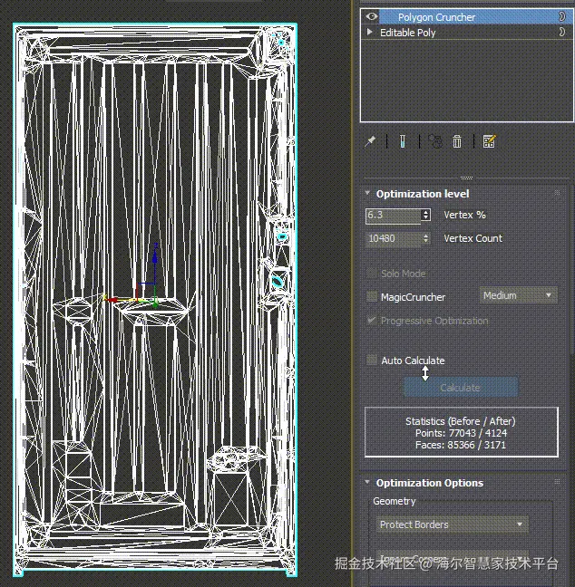 但是你可能会问既然 ProtectBorder 可能会导致边被合并,那为什么不该用 ExcludeBorder?因为,ExcludeBorder 会极大降低减面的效率,这可以从上文的 ExcludeBorder 动图里看到。
