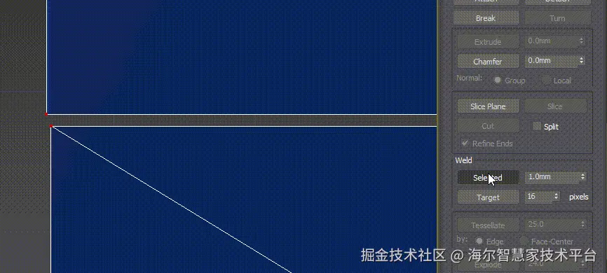 因此,为了准确让 QEM 识别出我们想要的轮廓,我们必须要对这个板子做一些模型修改,具体来说就是把分离的顶点“焊接(Weld)”在一起。