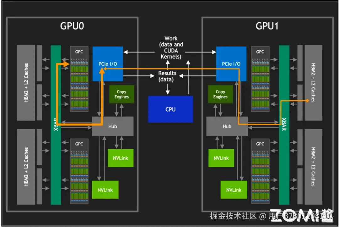 在多 GPU 系统中,NVLink 还起到了 XBARs 的作用,它作为不同 GPU 之间的桥梁,允许数据在 GPU 之间自由流动。还巧妙地避开了与 PCIe 总线的冲突,使得 NVLink 和 PCIe 可以作为互补的解决方案共存,共同为系统提供所需的数据传输能力。