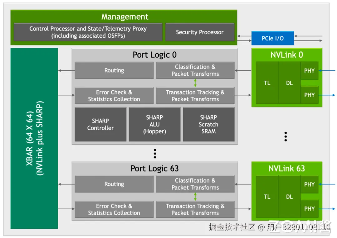 NVSwitch 中的交叉开关(XBAR),经过精心调整和优化,与 SHARP 模块的数据传输需求完美匹配。这一协同设计,确保了数据在 GPU 间传输时的高效率和低延迟,提升系统的整体性能。