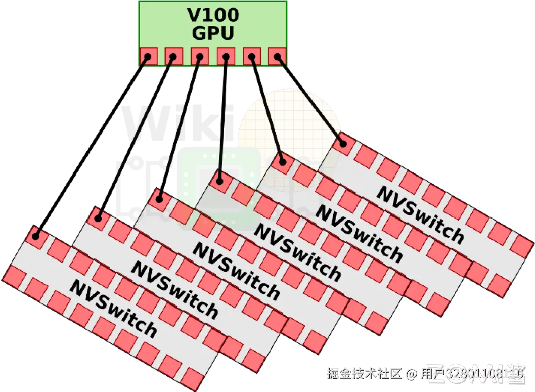 如上图所示,在 V100 架构中,每块 GPU 拥有 6 条 NVLink 通道,这些通道可以连接到 NVSwitch 上,从而形成一个高带宽的通信网络。在 DGX-2 系统中,8 个 V100 GPU 通过这些 NVLink 通道与 6 个 NVSwitch 相连,构建了一个强大的基板。