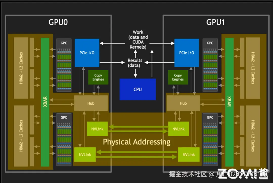 NVLink 技术的核心优势在于它能够绕过传统的 CPU 分配和调度机制,允许 GPU 之间进行直接的数据交换。这种设计不仅减少了数据传输的延迟,还大幅提升了整个系统的吞吐量。此外,通过 NVLink GPCs 可以访问卡间 HBM2 内存数据,也可以对其他 GPU 内的 HBM2 数据进行访问。