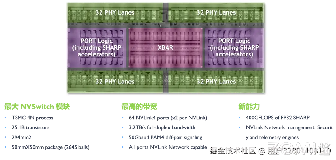 从上图可以看出,第三代 NVSwitch 采用了 TSMC 的 4N 工艺制造,即使在拥有大量晶体管和高带宽的情况下,也能保持较低的功耗。它提供了 64 个 NVLink 4 链路端口,允许构建包含大量 GPU 的复杂网络,同时保持每个 GPU 之间的高速通信。同时支持 3.2TB/s 的全双工带宽,显著提升了数据传输速率,使得大规模数据集的并行处理更加高效。