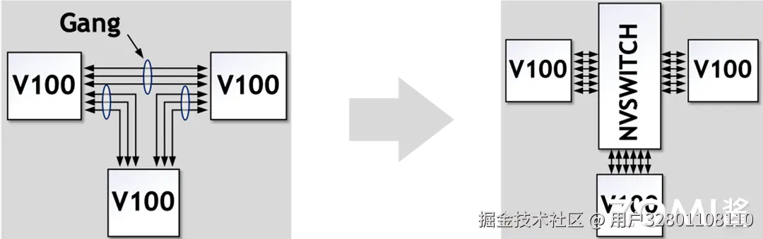 如上图所示,在没有 NVSwitch 的配置中,GPU 之间的连接通常是通过将 NVLinks 聚合成多个组(Gang)来实现的。这意味着多个 GPU 通过共享的 NVLink 链路进行通信。然而,这种方法的一个限制是任意两个 GPU 之间的最大带宽受限于它们所在 Gang 的 NVLink 数量和带宽。