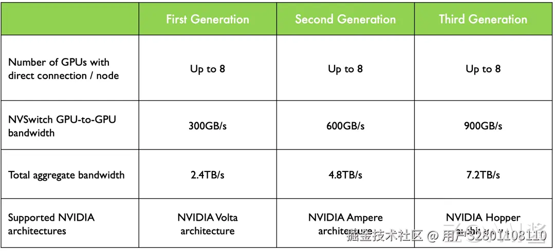 第一代的 NVSwitch 支持的 NVLink 2.0 技术,每个接口能够提供双通道,高达 50GB/s 的带宽。这意味着通过 NVSwitch,整个系统能够实现总计 900GB/s 的惊人带宽,极大地提升了数据传输速率和计算效率。