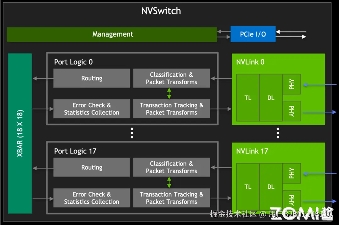 NVSwitch 中的交叉开关(XBAR)为数据传输提供了从点 A 到点 B 的唯一路径。这种设计确保了通信过程中的无阻塞和无干扰,进一步提升了数据传输的可靠性和系统的整体性能。