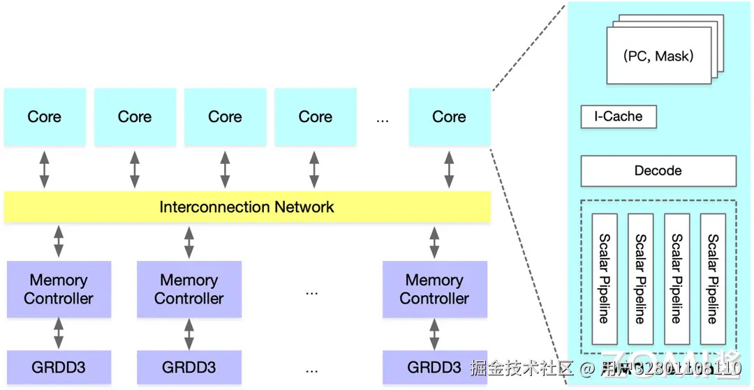 在 GPU 宏观架构层面,GDDR 里面的数据通过内存控制器(Memory Controller)传输到片内总线(Interconnection Network),然后分发到具体的核心(Cuda Core/Tensor Core),在每个执行核心中会有 SIMD 执行单元,从而实现并行计算。