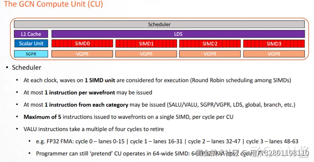 每个 CU 有 4 个 SIMD 计算单元,每个周期 CU 调度程序会从 4 个 SIMD 中选择一个进行执行,并检查线程是否准备好执行。AMD MI300 支持 ROCm 6,支持 TF32 和 FP8 数据类型,Transformer Engine 和结构化稀疏性,AI/ML 框架等。