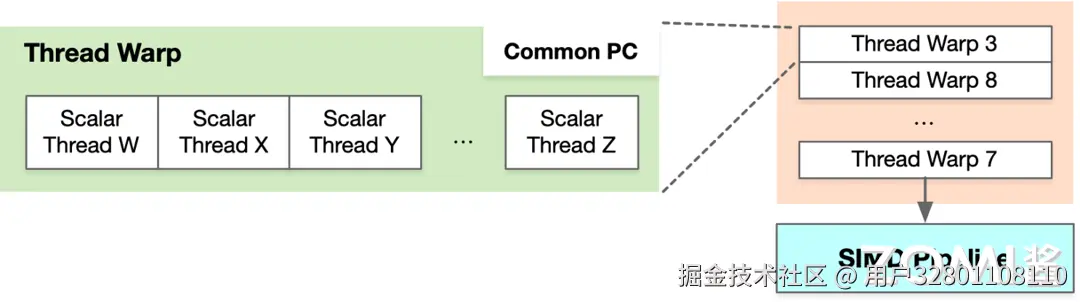 Warp 是在不同地址数据下,执行相同指令的线程集合,所有线程执行相同的代码,可以看出 Thread Warp 中有很多个 Thread,多个 Warp 组成 SIMD Pipeline 执行对应的操作。