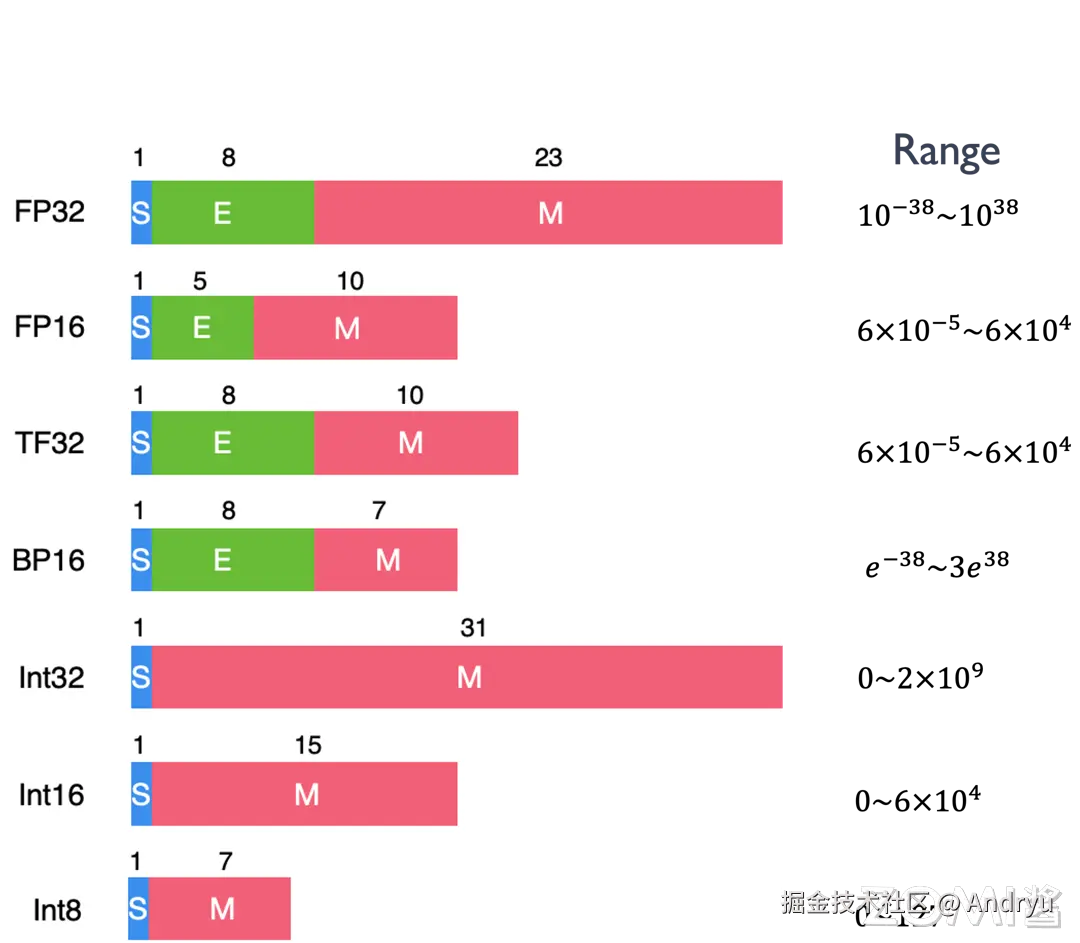 下图是现有 AI 模型中出现过的数据类型位宽和定义,可以看到关于浮点数据类型在 E 和 M 位宽有很多种设计,比如对同样的 16bit 和 8bit 位宽的浮点数,出现了不同的 E,M 位宽设计,这些数据类型的出现也是 AI 领域在具体实践应用中,对软件和硬件设计不断优化的表现。