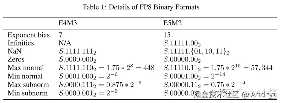 FP32、FP16、BF16 和 FP8 E5M2 的浮点数表示都遵循前面提到的 IEEE754 浮点数据标准,FP8 的 E4M3 则不完全遵循 IEEE754 标准约定,主要不同在于当指数位全为 1 时候,去掉了无穷大类型的表示,约定仅当尾数全为 1 表示 NaN,否则仍然表示规格化数据的值,这样可以增加数据的表示范围。比如当二进制序列为 0 1111 110 时候,表示的值为 。如果仍完全采用 IEEE754 标准,支持的最大的数据是 240。下表展示了 FP8 两种类型的数据范围一些细节。