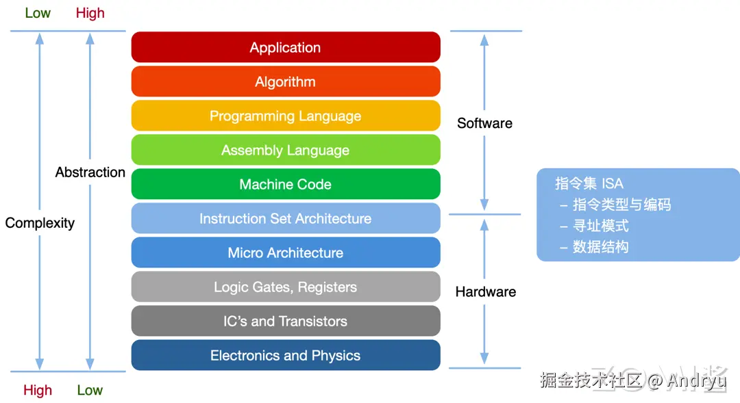 现在从更宏观的视角来看看指令集架构,可以将指令集架构理解为一个抽象层,它是处理器底层硬件与运行在硬件上的软件之间桥梁和接口,如下层所示上面是软件部分,下面是硬件部分。
