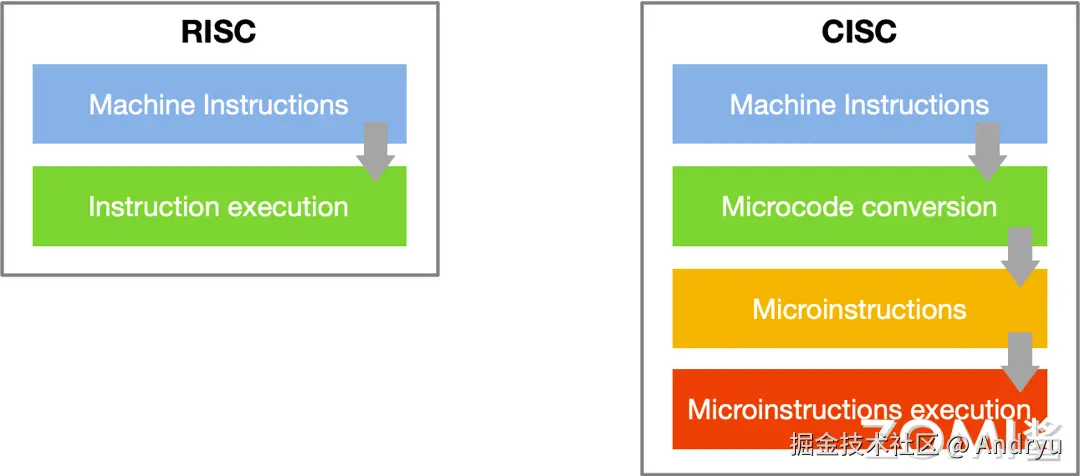 目前看来,按照指令系统复杂程度的不同,CPU 的 ISA 可分为 CISC 和 RISC 两大阵营。CISC 是指复杂指令系统计算机(Complex Instruction Set Computer);RISC 是指精简指令系统计算机(Reduced Instruction Set Computer),如下图所示也是很好区分 RISC 和 CISC。
