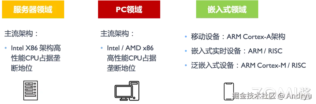 在上一个小节,我们介绍了诸多指令集架构,像是 x86、Arm 等等,接下来我们就来聊一点更贴近生活的,分为服务器、PC 以及嵌入式三个领域来介绍一下相应指令集所对应的应用场景。