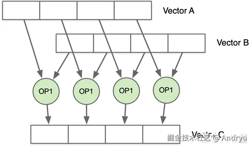例如将两个 vector 作为操作数,对于两个 vector 的操作数进行相同的乘法操作,下面以 vector 为 4 个元素为例,将向量 A 和向量 B 进行相乘计算得到结果 C。